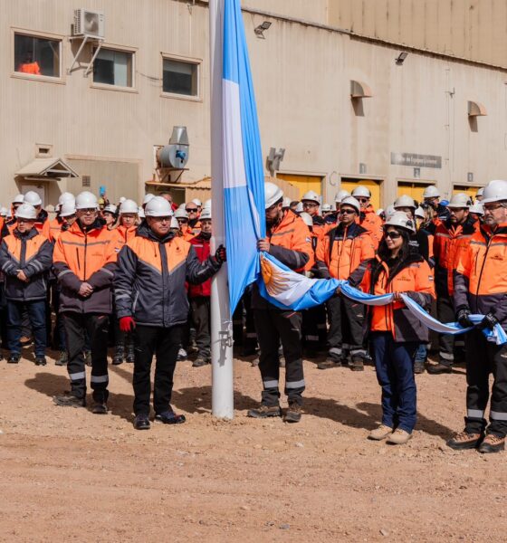 Posteriormente, la visita continuó en el taller de camiones, donde se realizó un acto especial con la confección de una bandera argentina y la entonación del Himno Nacional, en homenaje al Día de la Minería. Allí también se ofreció un almuerzo para 300 trabajadores que esperaron la llegada del mandatario para compartir la celebración.