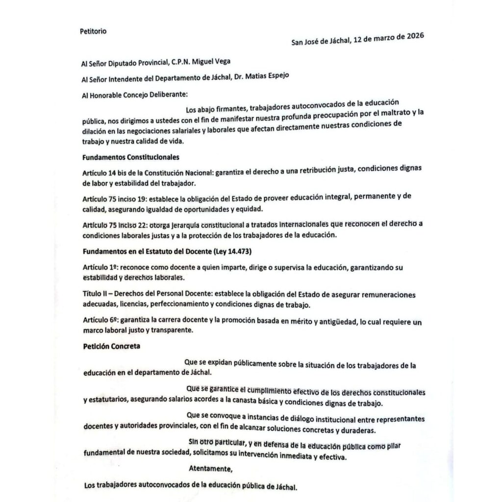 Docentes autoconvocados entregaron petitorio a las autoridades y este jueves marcharán hacia la Ruta 150 - Jáchal Magazine