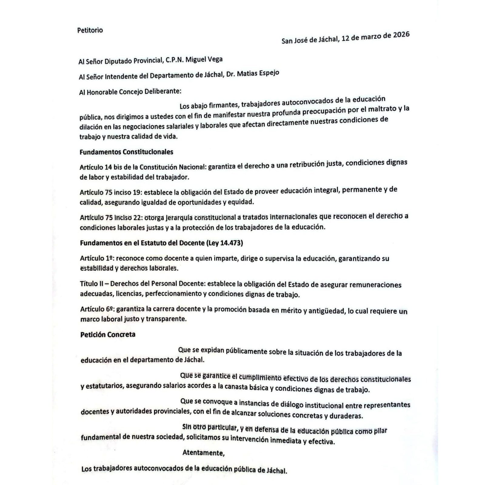 Los manifestantes fueron recibidos en el edificio municipal por el intendente Matías Espejo, a quien le entregaron un petitorio formal solicitando que en su figura como máxima autoridad departamental, pueda dentro de sus competencias, hacer saber la condición de los docentes jachalleros en las esferas provinciales. Luego el intendente se reunión en la explanada de ingreso al edificio municipal con el resto de los manifestantes, donde les comunicó su total apoyo a la lucha por un salario digno.