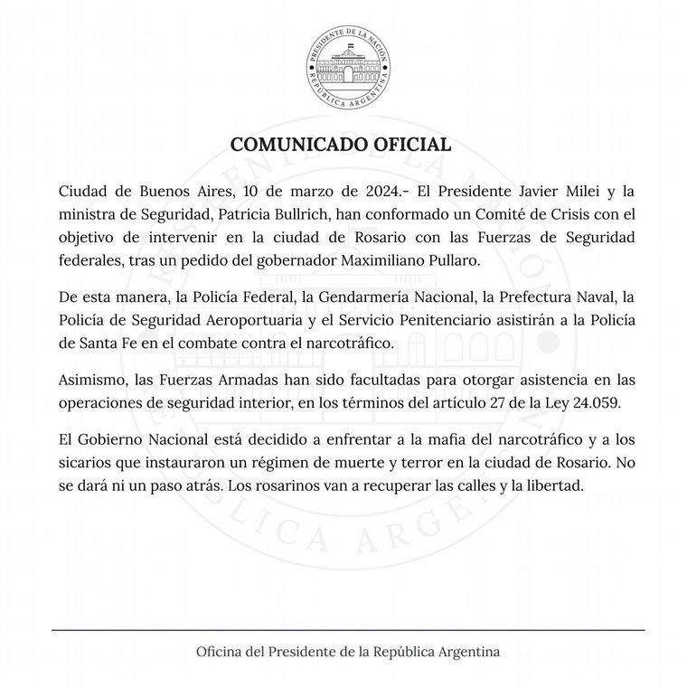Por su parte desde la oficina del Ejecutivo se emitió un comunicado donde indica que “el presidente Javier Milei y la ministra de Seguridad, Patricia Bullrich, han conformado un Comité de Crisis con el objetivo de intervenir en la ciudad de Rosario con las Fuerzas de Seguridad federales, tras el pedido del gobernador Maximiliano Pullaro”.