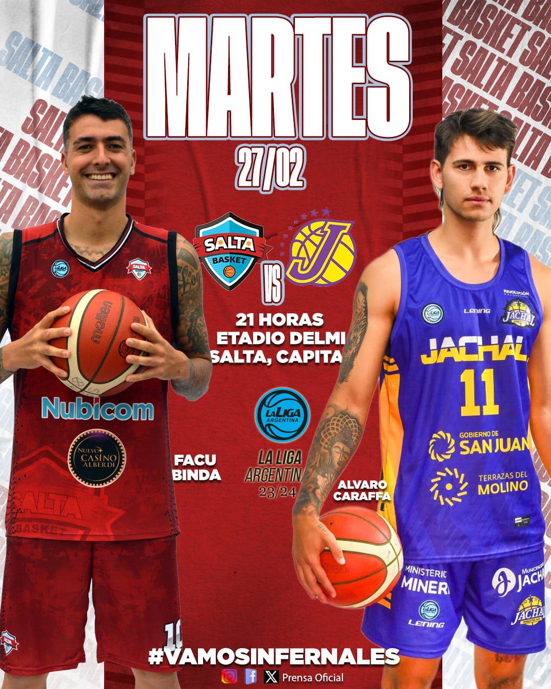 Este martes a partir de las 21hs, en el Estadio Delmi de la capital salteña, Los Infernales recibirán al elenco de Jáchal BC, en un nuevo encuentro de La Liga Argentina, Conferencia Norte de la fase regular donde ambos equipos llegan confiados, El equipo local de Salta viene de una buena gira por tierras catamarqueñas y santiagueñas, ganando el primer juego frente a Montmartre (83-60) y tras presentar batalla no pudieron frente a Independiente (75-62).