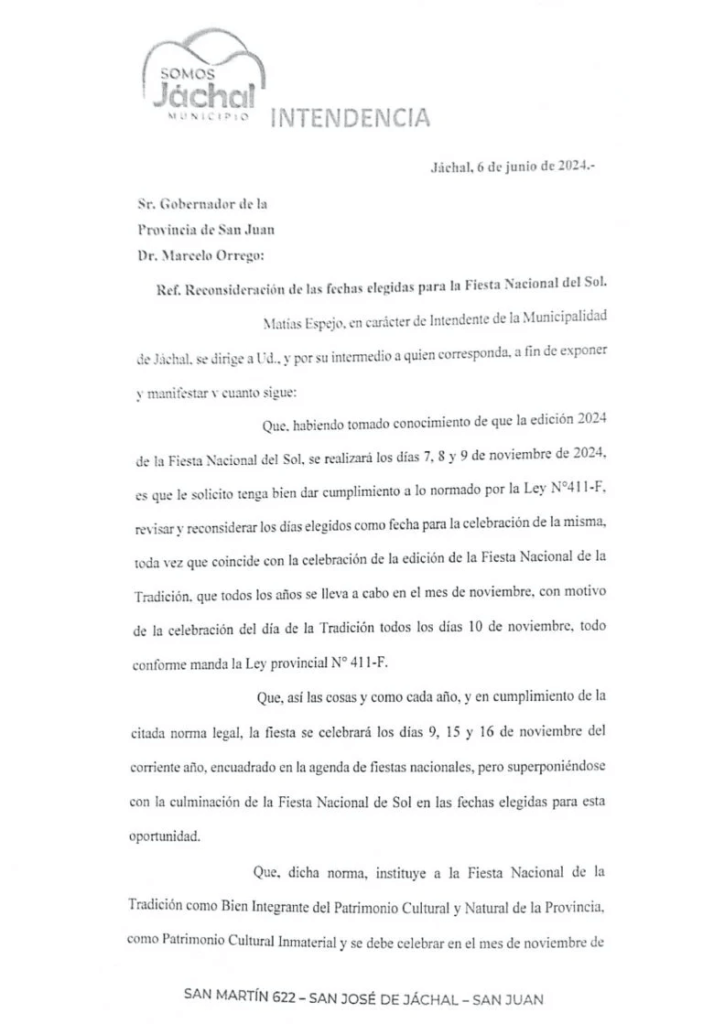 En la nota presentada al gobernador, el municipio de Jáchal fundamenta su solicitud en la normativa provincial (N°411-F), que estipula que la Fiesta Nacional del Sol debe realizarse la última semana de febrero. Además, destaca que la Fiesta Nacional de la Tradición, que este año celebra su 63ª edición, está reconocida como “Patrimonio Cultural Inmaterial” y figura en la Agenda de Fiestas Nacionales de Argentina.