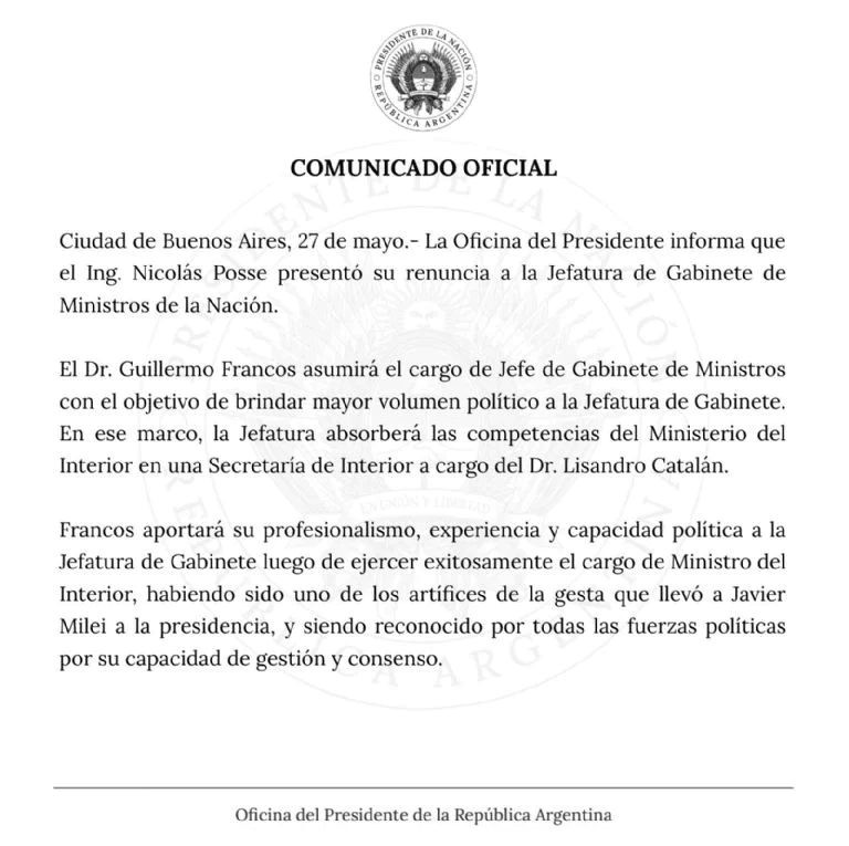 En un comunicado de prensa de la jefatura de Gabinete, se indicó que “Javier Milei aceptó la renuncia presentada por Nicolás Posse”. Según esta difusión, la decisión estuvo motivada por “la diferencia de criterios y expectativas en la marcha del Gobierno y las tareas encomendadas”.