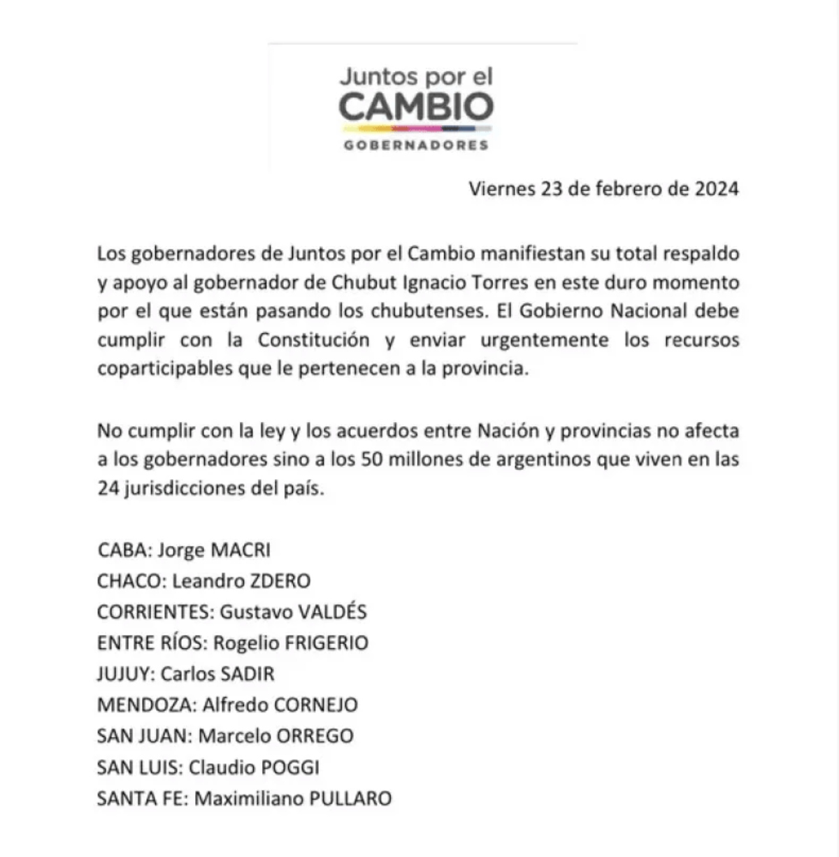 “Gobernadores de Juntos por el Cambio manifiestan su total respaldo y apoyo al gobernador de Chubut Ignacio Torres en este duro momento por el que están pasando los chubutenses”, sostienen, al tiempo que conminan al gobierno de Milei a “cumplir con la Constitución y enviar urgentemente los recursos que le pertenecen a la provincia”.