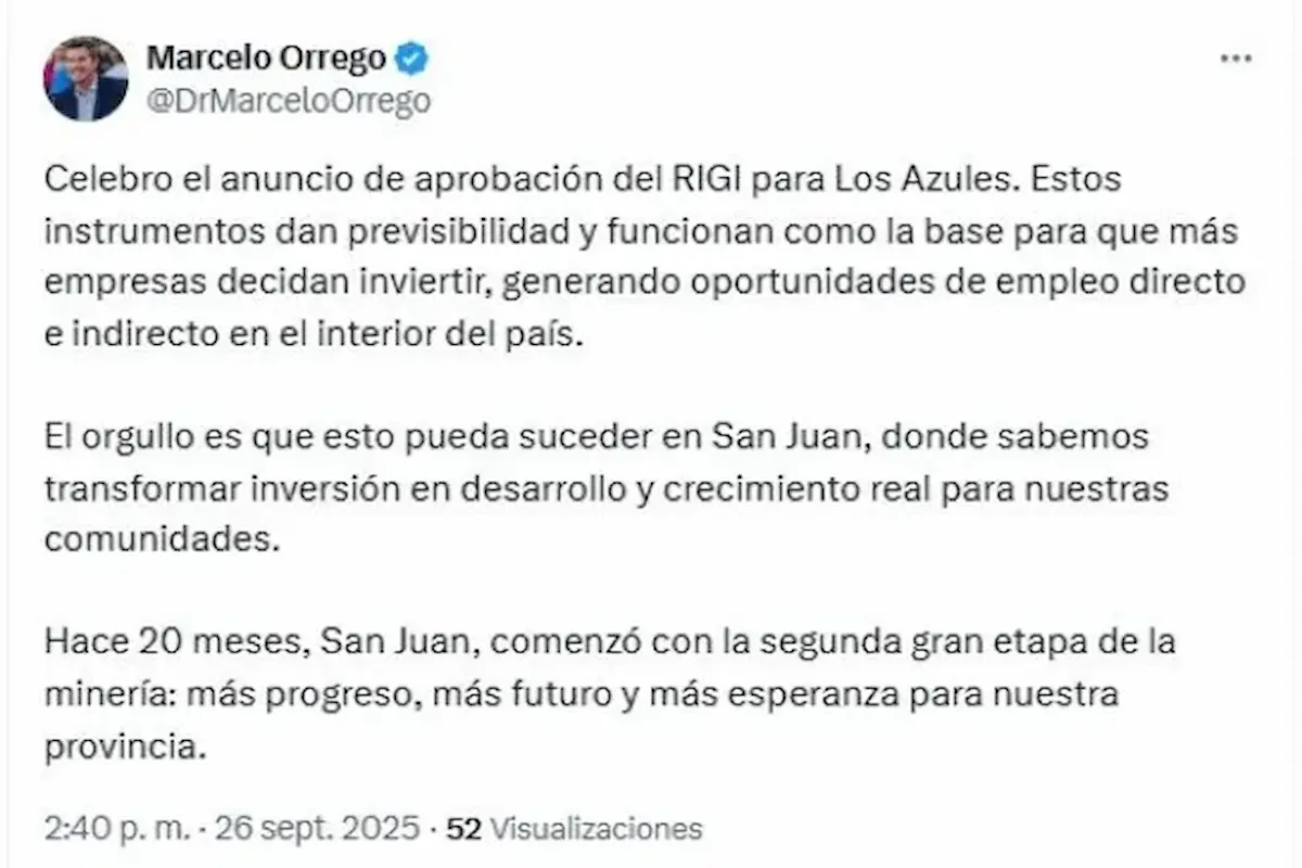 “Celebro el anuncio de aprobación del RIGI para Los Azules. Estos instrumentos dan previsibilidad y funcionan como la base para que más empresas decidan invertir, generando oportunidades de empleo directo e indirecto en el interior del país”.