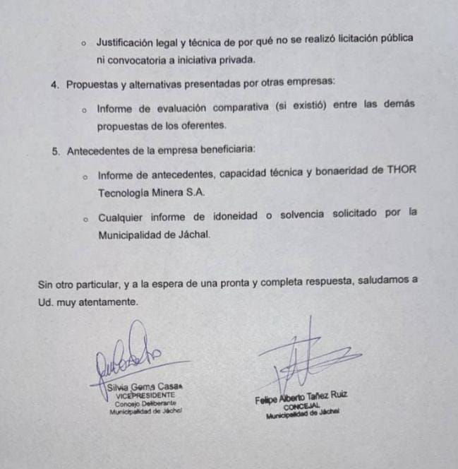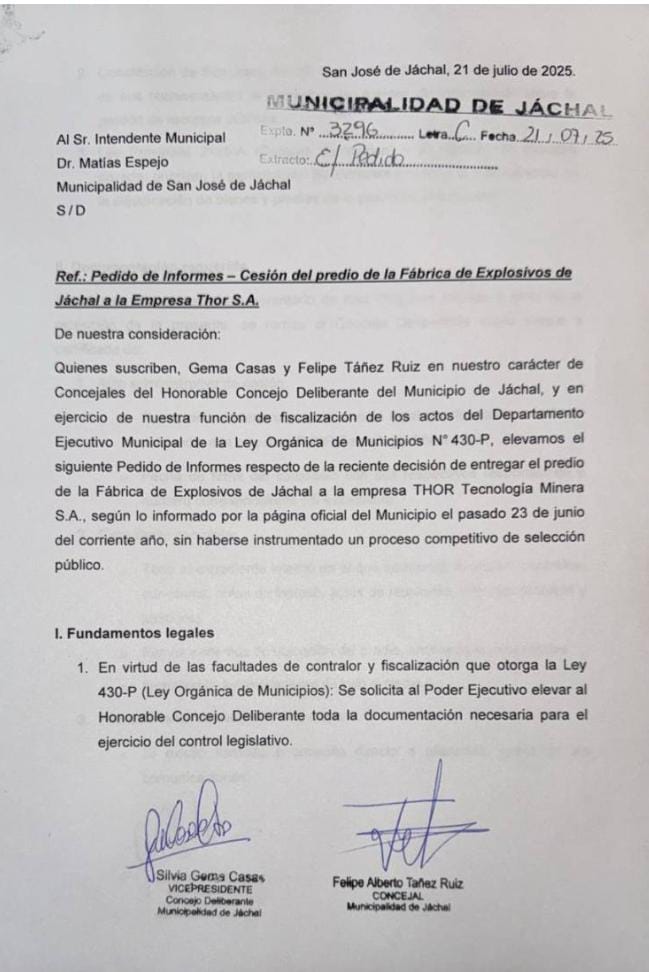 Los concejales Gema Casas y Felipe Táñez Ruiz presentaron un pedido formal de informes dirigido al intendente Matías Espejo, con el objetivo de conocer en detalle las condiciones bajo las cuales se cedió el predio de la ex fábrica de explosivos de Jáchal a la empresa THOR Tecnología Minera S.A.