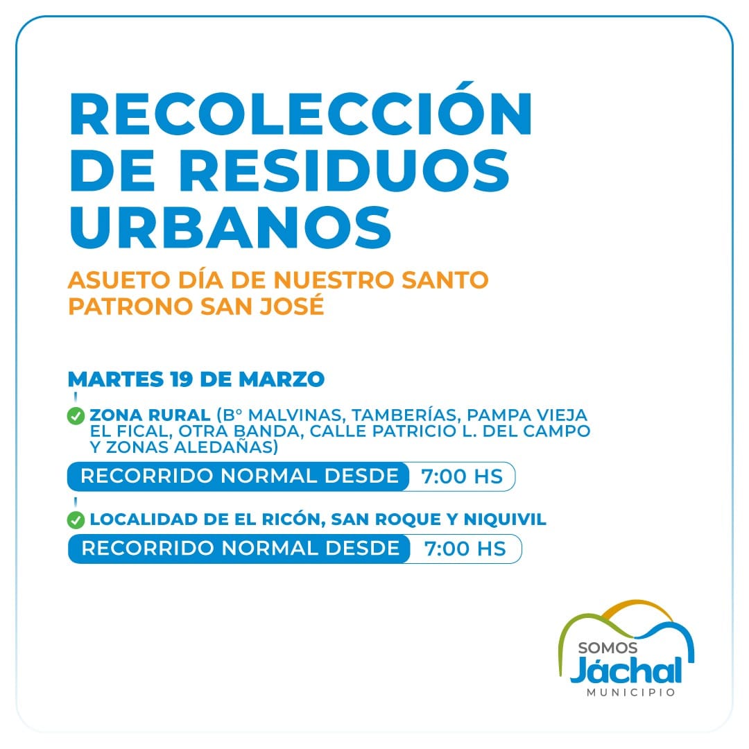El Municipio de Jáchal informó a todos los residentes de la comunidad que el servicio de recolección de residuos urbanos estará en pleno funcionamiento durante el día martes 19 de marzo.
