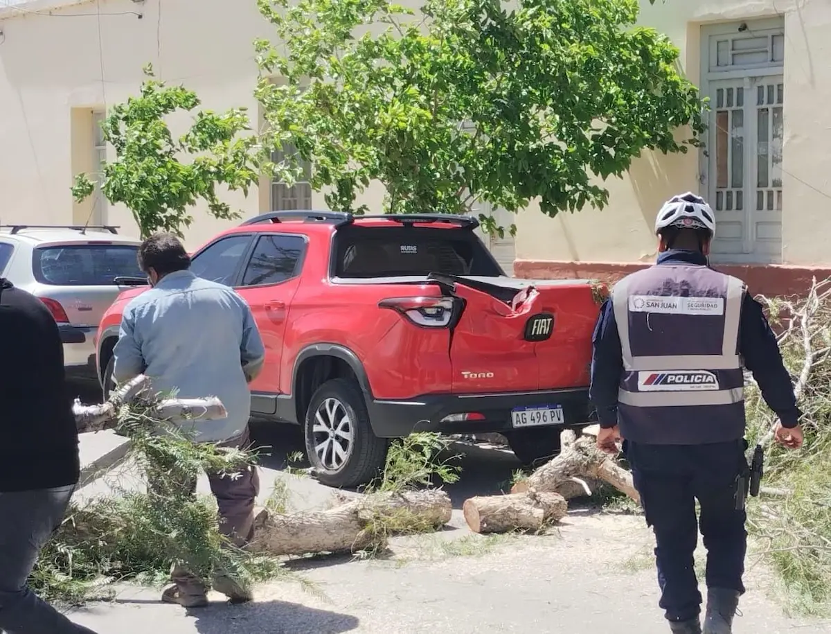 JÁCHAL. – Las fuertes ráfagas provocaron la caída de árboles, daños materiales e incendios, obligando a la intervención de Policía, Bomberos y personal de emergencia.